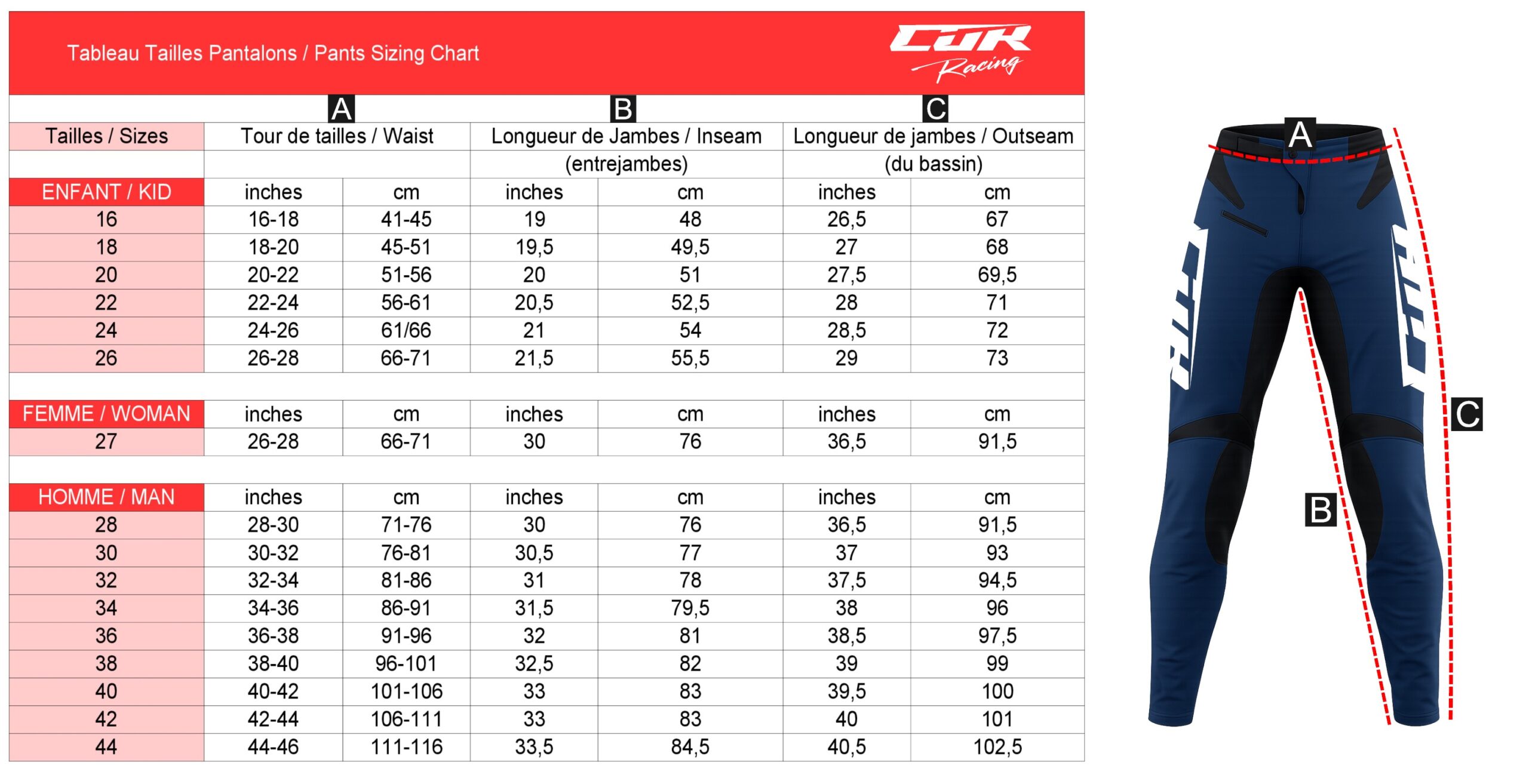 La taille 27 correspond au tour de taille 26 et la longueur 28, généralement taillé pour les Femmes.